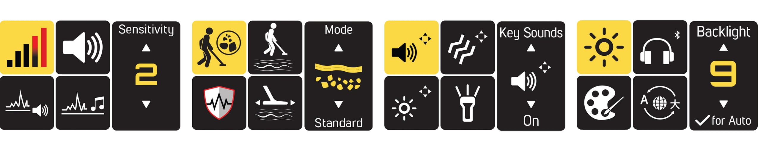 Прилад оснащений двома режимами інтерфейсу. Easy Menu призначене для швидкого запуску та базових налаштувань, тоді як Expert Menu відкриває доступ до тонкого регулювання параметрів для досвідчених користувачів. Це дозволяє адаптувати металошукач під конкретний тип ґрунту, розмір цілей та умови пошуку.